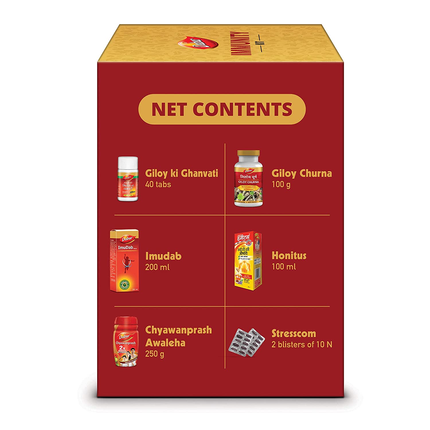 Dabur Immunity Kit contains the goodness of 6 ayurvedic Products – Dabur Chyawanprash , Honitus , Stresscom ,Dabur Giloy ki Ghanvati , Dabur Giloy Churna and Dabur Imuda Syurp .Dabur Chyawanprash - Two spoons daily of Dabur Chyawanprash supports immunity and is beneficial for overall health and well being. The primary action of Dabur Chyawanprash is to bolster the immune system . Amalaki (the main ingredient) aids in the elimination of ama (toxins). Therefore, regular use of Dabur Chyawanprash helps strenghten body’s natural defense systems.