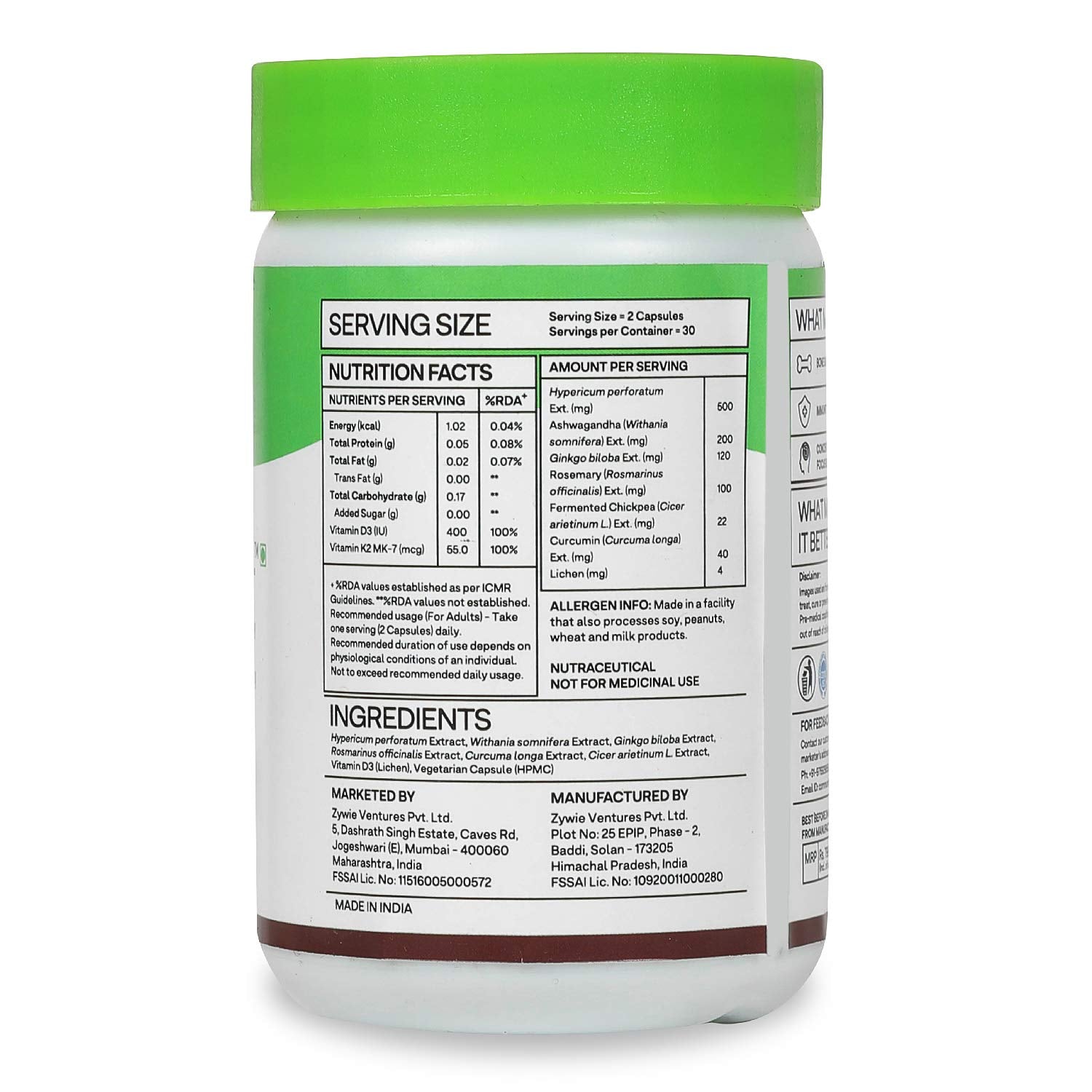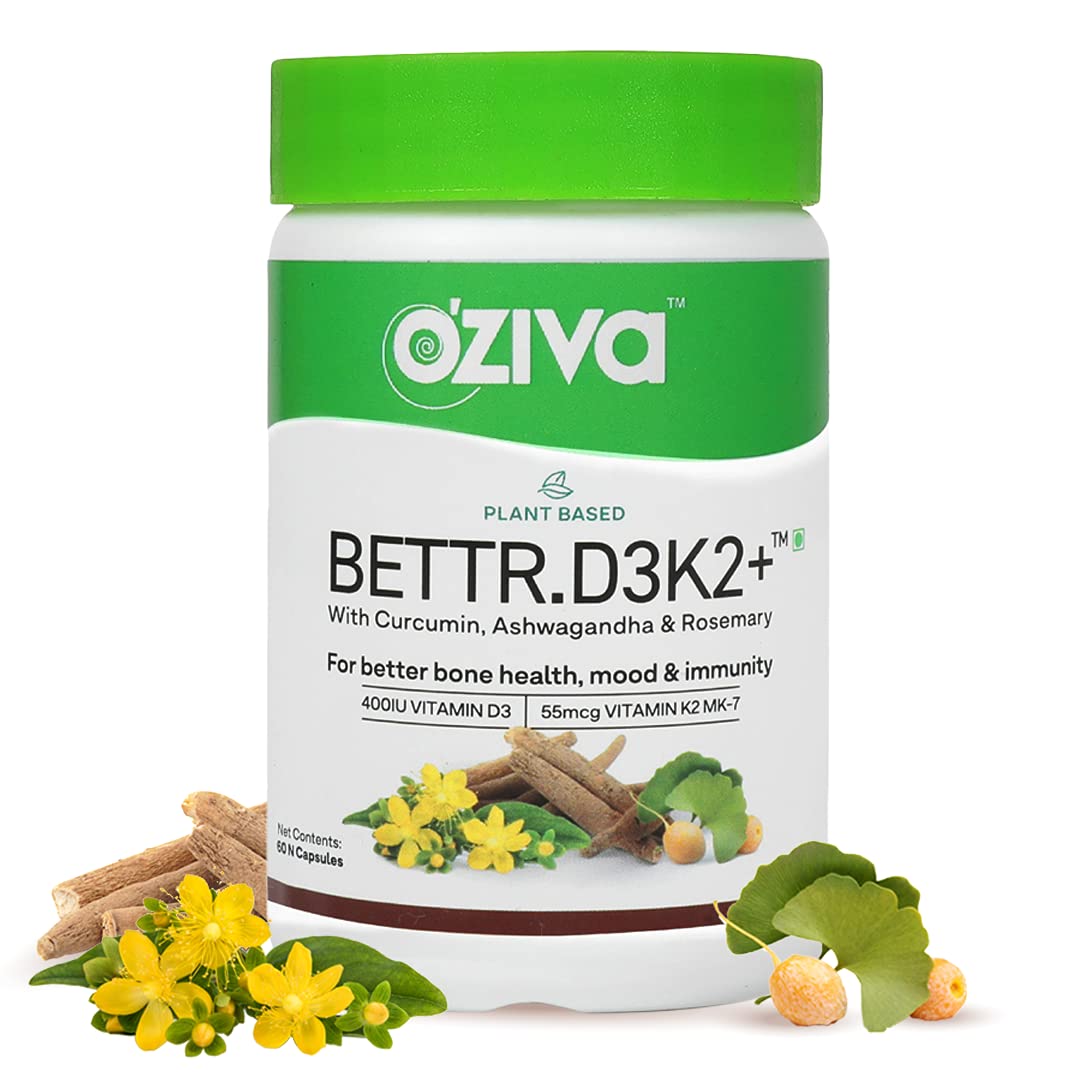 OZiva Bettr.D3K2+ (Plant based Vitamin D3 K2 with Curcumin, Ashwagandha & Rosemary) for Anti-Inflammation, Mood & Immunity, 60 veg Capsules