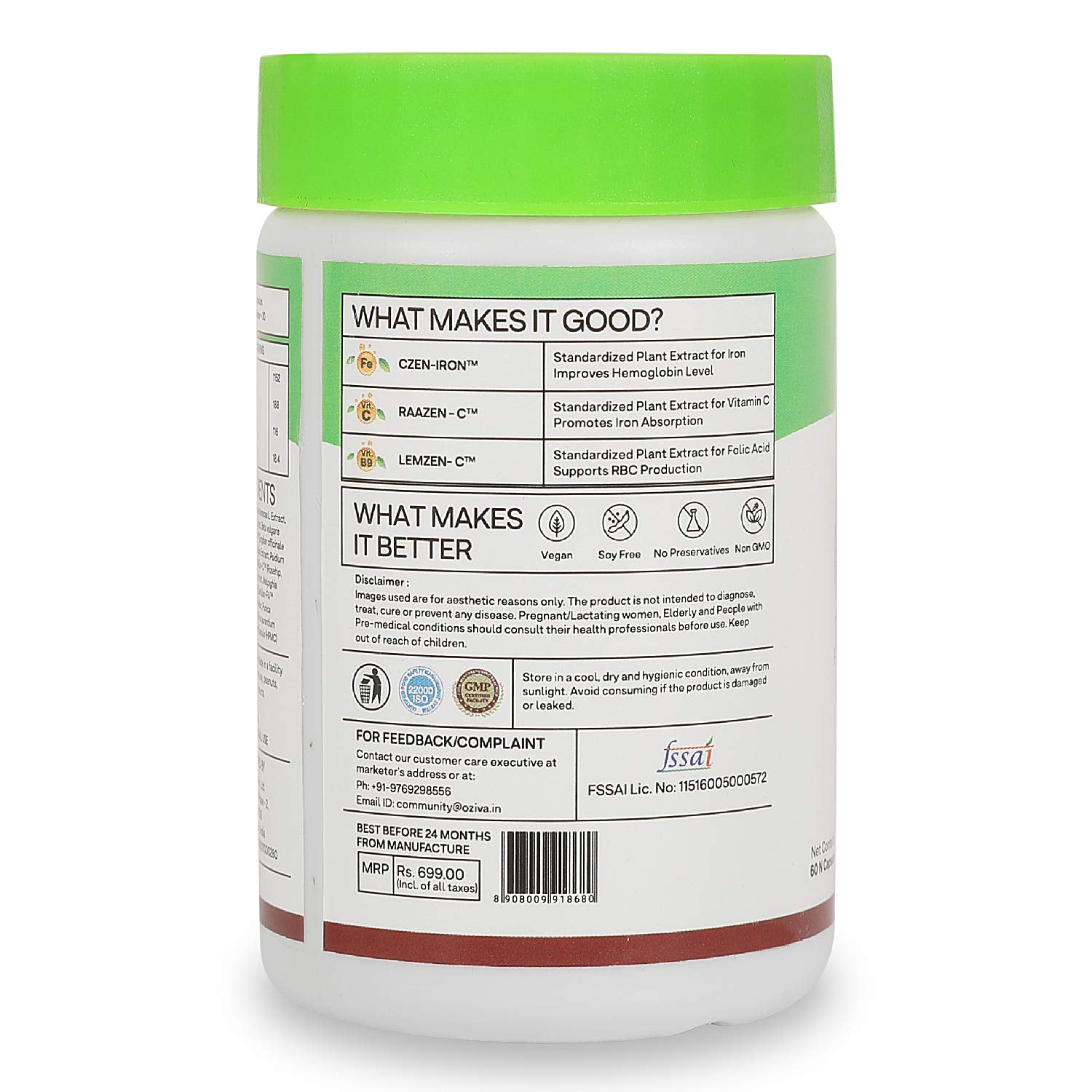 OZiva Bettr. Iron+ (Plant Based Iron with Vitamin C, Folic Acid, Zinc & Moringa) for Improved Hemoglobin, Oxygen binding capacity, & Immunity, Iron supplements, 60 veg capsules (60 capsules)