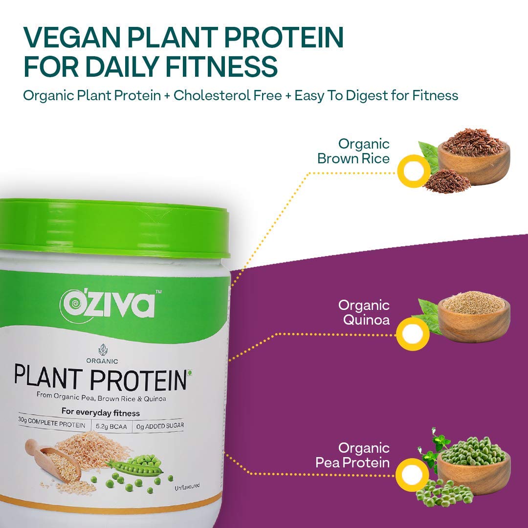OZiva Organic Plant Protein (30g Vegan Protein - Pea protein a, Brown Rice Protein & Quinoa, Soy free) For Everyday Fitness, Boosts Immunity, Unflavored, 500mg