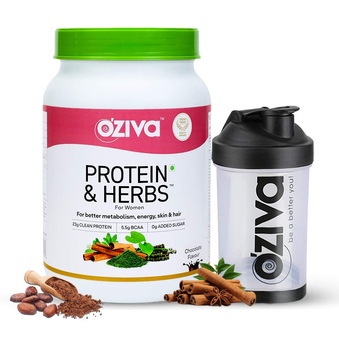 OZiva Protein & Herbs, Women,Natural Protein Powder with Ayurvedic Herbs like Shatavari, Giloy, Curcumin & Multivitamins for Better Metabolism Skin & Hair, Chocolate, 1kg + Black Shaker