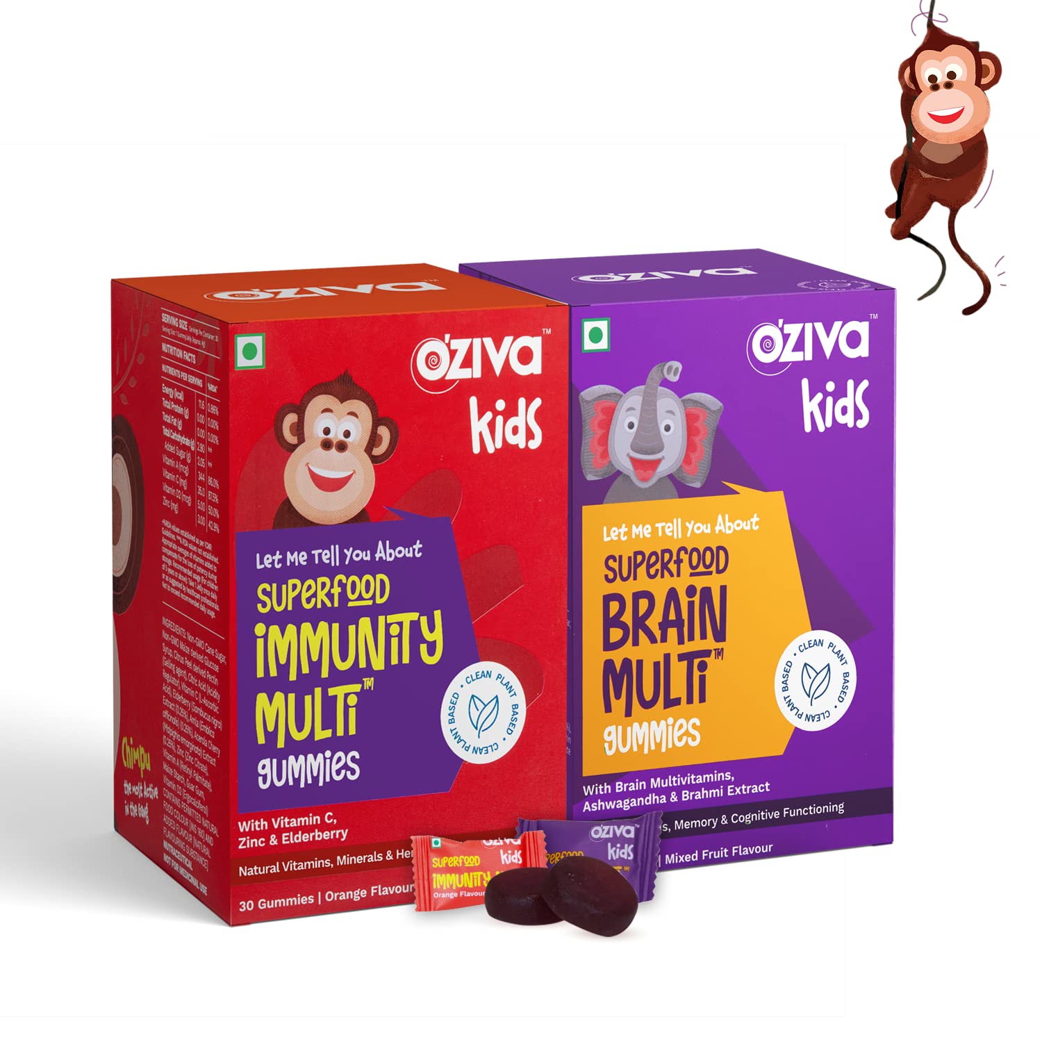 OZiva Superfood For Super Kids (Immunity + Brain Multi Vitamin Gummies) For 5 years & Above | Pack Of 2 - 30 Gummies Each | With Vitamin C, Zinc, Brahmi & Ashwagandha